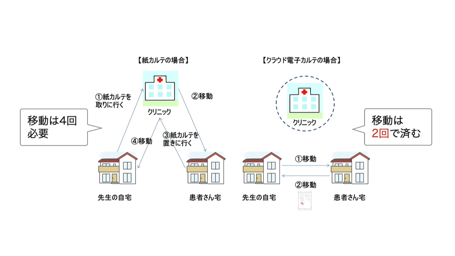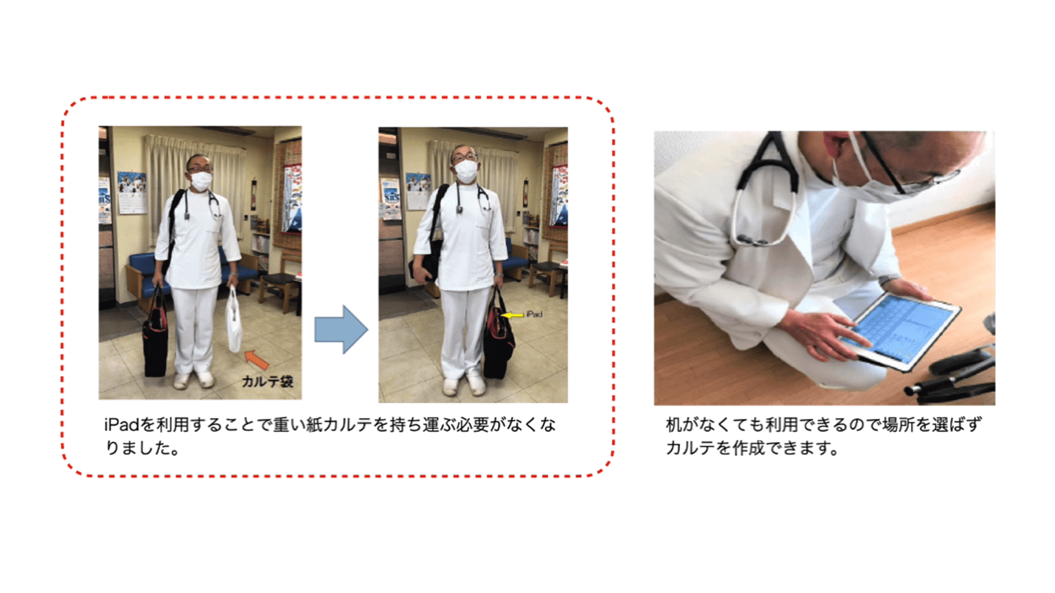 大量の紙カルテを持ち歩くのは負担が大きいだけでなく、紛失のリスクにも。紙カルテもPCも不要、iPad1台で訪問先に向かってOK - 院内でも処置室やリハ室など別室でのカルテ記載が可能