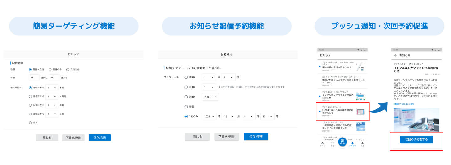 予約のリマインド通知や、クリニックからのお知らせをアプリ上で配信することで、来院促進に繋がります。例えば「処方が切れる3日前の患者に来院を促す」「特定の年代の患者にワクチンの入荷情報を配信する」など患者に合わせた内容・タイミングでの柔軟な配信が可能です。