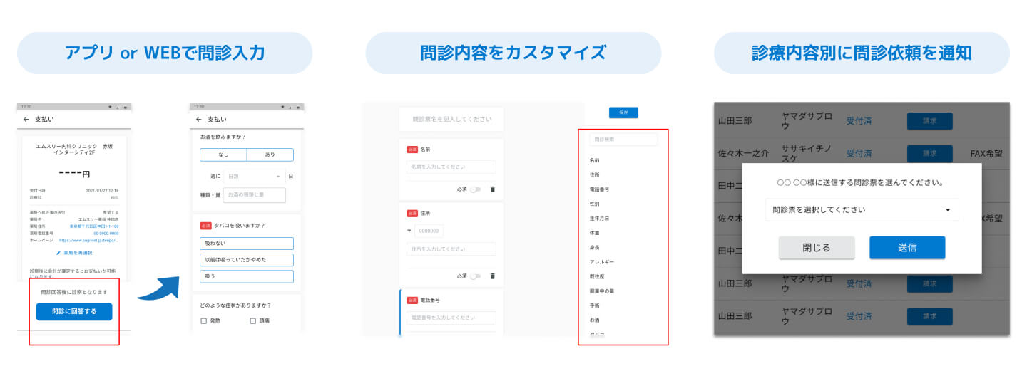 患者はスマホやPCから来院前に問診入力ができ、クリニックは問診内容を自由にカスタマイズすることが可能です。来院前の事前問診で、待ち時間と問診対応業務を削減できます。また、問診結果はエムスリーデジカル(電子カルテ)に自動で連携されます。