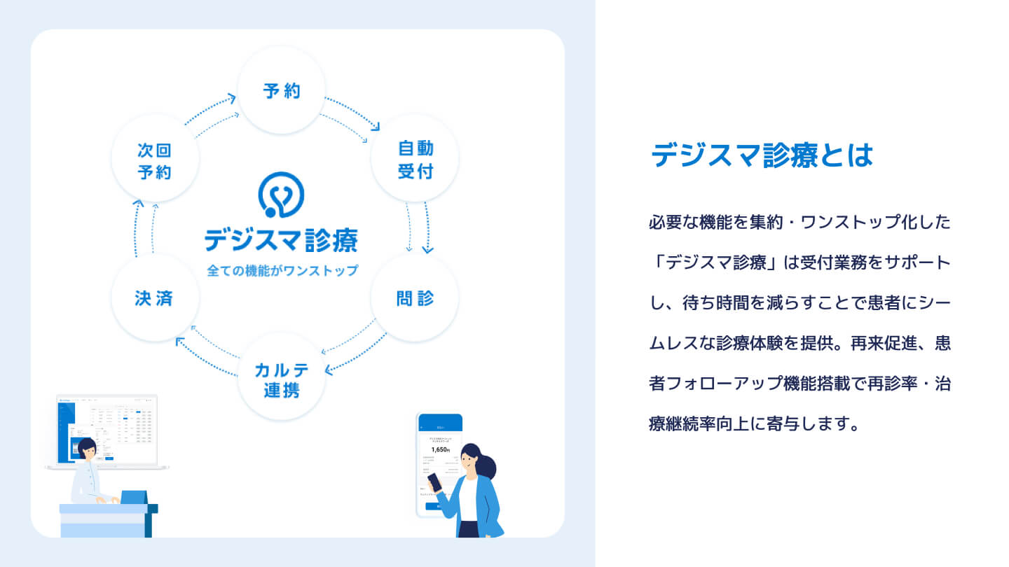 デジスマ診療は、東証プライム市場上場のエムスリーグループが提供する実績豊富なクラウド型診療支援システムです。予約から問診、自動受付、そして決済までの一連の流れを、一つのパッケージで完結できるのが大きな特長です。