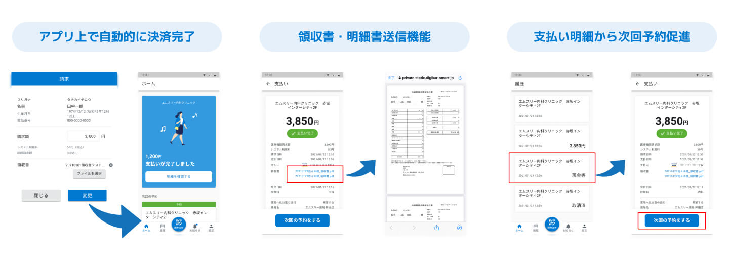 診察代の後払いにより、患者は会計待ちなしで帰宅することが可能です。また、会計処理をまとめて行えるので、混雑時の受付業務の負担軽減も期待できます。さらに領収書データ添付機能により、オンライン診療や往診時の請求にも便利です。
