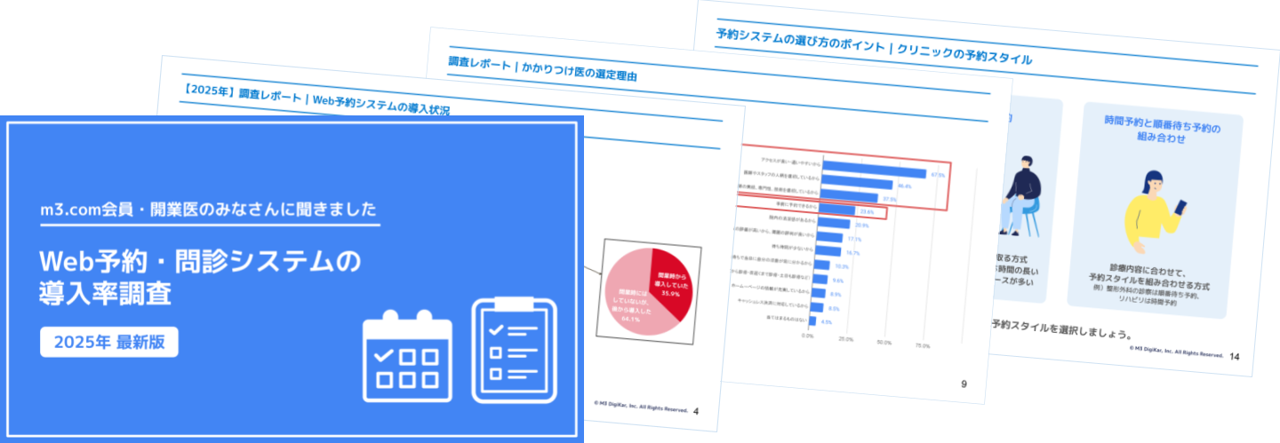 多くのクリニックが導入している予約・問診システムの最新動向を知りたい方へ。以下のリンクより導入率調査レポートを無料でご覧いただけます。