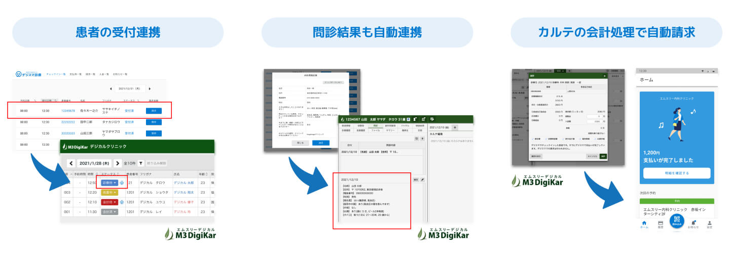デジスマ診療は、予約、問診、会計の情報をエムスリーデジカル(電子カルテ)と連携することができます。電子カルテとの連携によって、システムごとにバラバラになっている患者情報を一元管理できるようになり、さらなる業務効率化に貢献します。