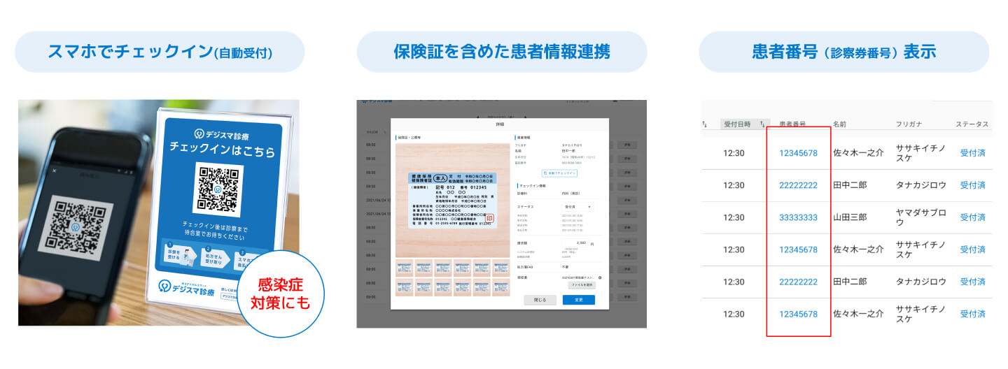 QRコードを活用した自動受付機能により、診察券の受け渡しが不要となり、受付業務を大幅に効率化できます。さらに、患者が登録した保険証情報が連携されるため、保険証の確認作業がラクになります。