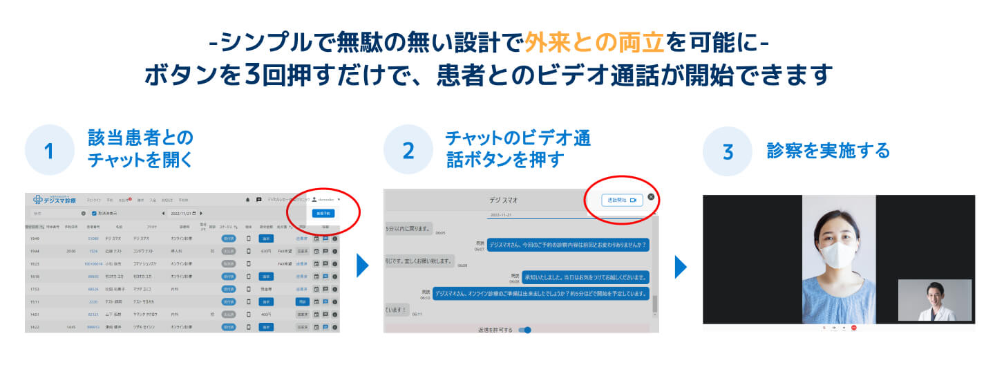 ワンタッチでビデオ通話を開始できるシンプルな設計が好評です。オンライン・対面の切り替えもスムーズに行えるハイブリッド運用を実現し、顧客満足度と再診率のアップにつながります。