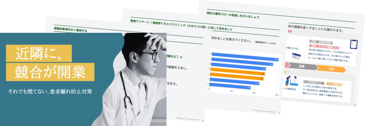 近隣に競合が開業しても安心。患者さんの離脱を防ぎ、選ばれ続けるクリニックになるための具体的な対策をまとめた資料を無料でご覧いただけます。