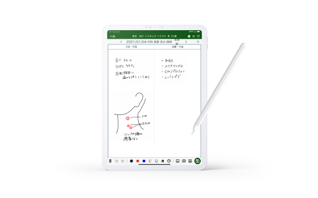 - iPad手書き補助アプリ: タイピングではなく手書きでカルテを記載したい方や、シェーマに細かく書き込みたい方におすすめの手書き補助アプリです。紙カルテを超える書き心地でお使いいただけます。